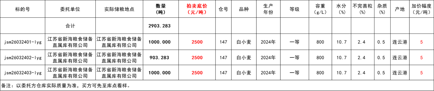 受江苏省新海粮食储备直属库有限公司委托,江苏粮油商品交易市场暨连云港分市场举办本次地方小麦竞价销售交易活动。具体事宜公告如下: