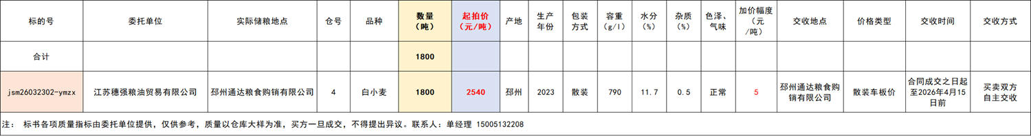 2.本次竞价销售交易底价:2560元/吨,2540元/吨,(交易价格于2026年3月23日更新)竞价幅度为人民币5元/吨。交易价格类型为:邳州通达粮食购销有限公司散装车板价。