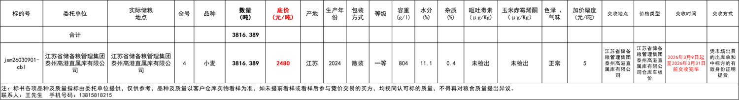 交易价格:江苏省储备粮管理集团泰州高港直属库有限公司仓库车板价。应价起点数量为每个标的的全部数量。销售底价:2480元/吨,竞价阶梯5元/吨,收取中标方成交金额1.5‰的手续费(成交后手续费直接从交易保证金中扣除,无需另外缴纳)。