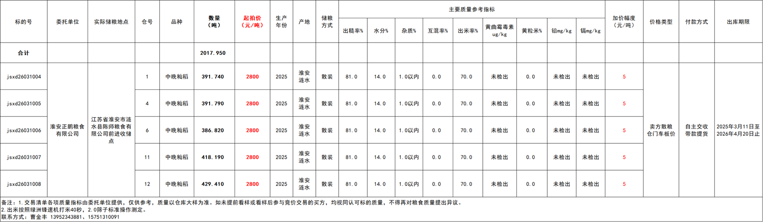 受淮安正鹏粮食有限公司委托,江苏粮油商品交易市场举办本次商品中晚籼稻竞价销售交易活动。具体事宜公告如下: