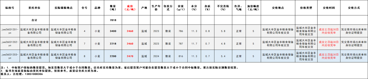 交易价格:盐城大丰区金丰粮食储备有限公司车板交货,标的底价2460元/吨、2470元/吨。竞价阶梯5元/吨,应价起点数量为每个标的的全部数量,收取中标方成交金额1.5‰的手续费(成交后手续费直接从交易保证金中扣除,无需另外缴纳)。