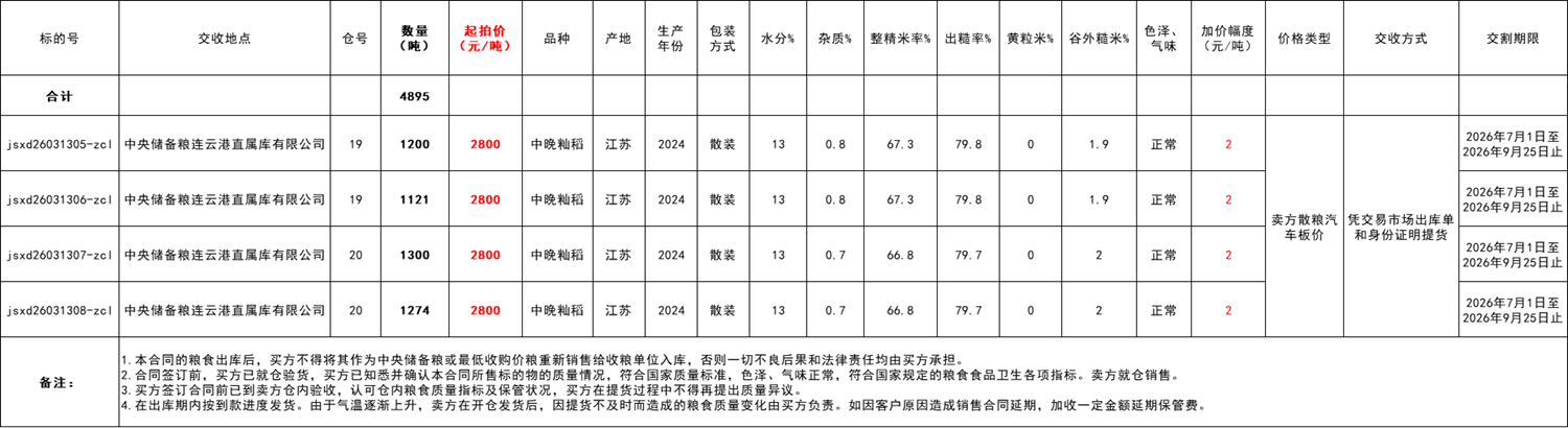买受人货款汇至江苏粮油商品交易市场账户,凭江苏粮油商品交易市场出库单和身份证明到卖方库点提货,交割完成后买卖双方凭确认单到交易市场退保证金(保证金在开出库单时不冲抵货款,待合同履约结束后统一释放)。交款期为合同成交之日起至2026年7月1日前,交割期为为合同成交之日起至2026年9月25日止。由于气温逐渐上升,卖方在开仓发货后,因提货不及时而造成的粮食质量变化由买方负责。如因客户原因造成销售合同延期,加收一定金额延期保管费。