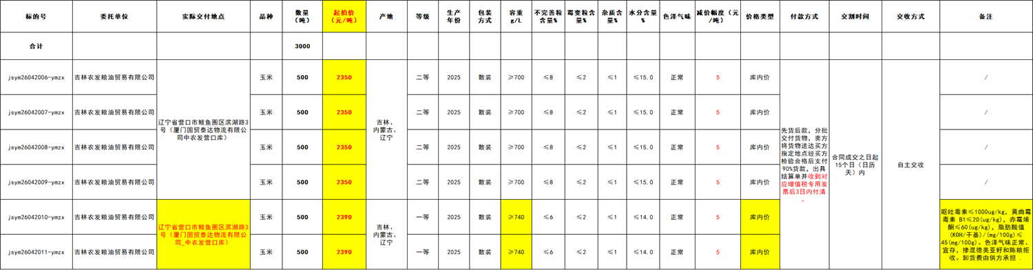 (价格、质量、交收地点于2026年4月21日调整,详见补充公告及更新交易清单)