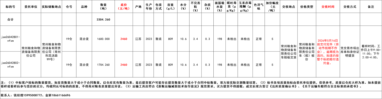 交易价格:常州粮食和物资储备有限责任公司车船板价。应价起点数量为每个标的的全部数量。销售底价:2023年产混合麦2460元/吨,竞价阶梯5元/吨,收取中标方成交金额2‰的手续费。